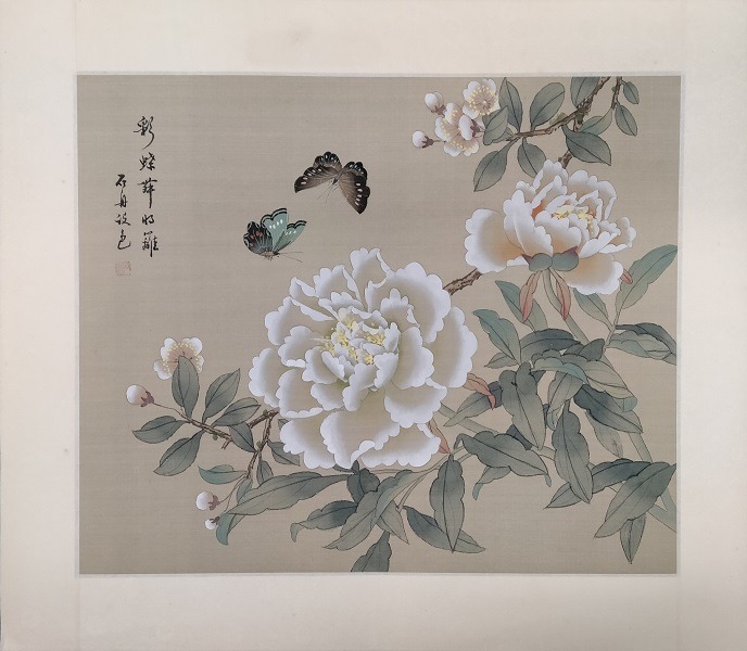 Questo dipinto raffigura due farfalle e fiori di camelie. Sul lato destro è visibile una calligrafia e un timbro dell’artista in inchiostro rosso (polvere di cinabro). Creazione di ottima qualità e raffinatezza.