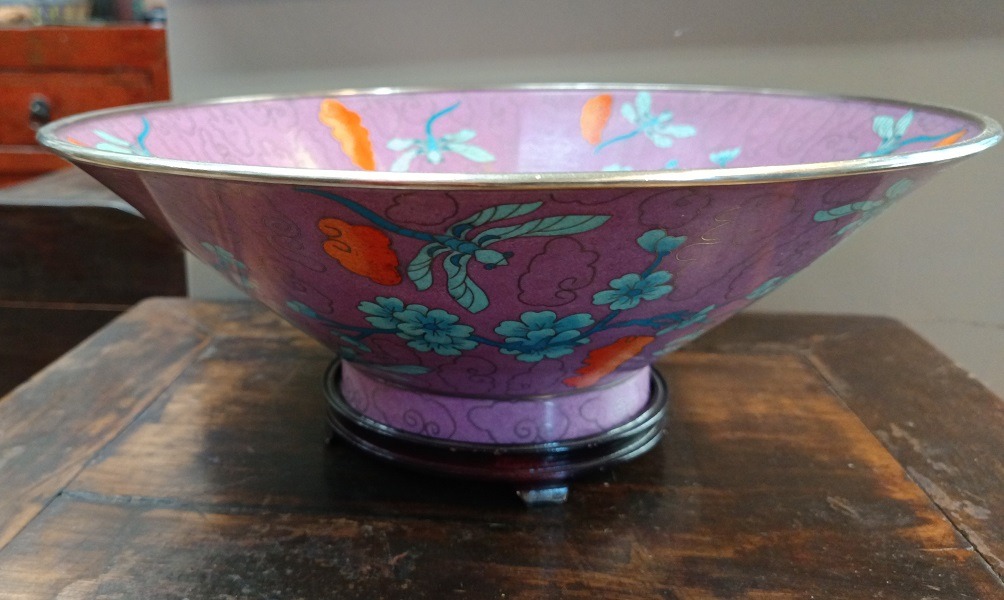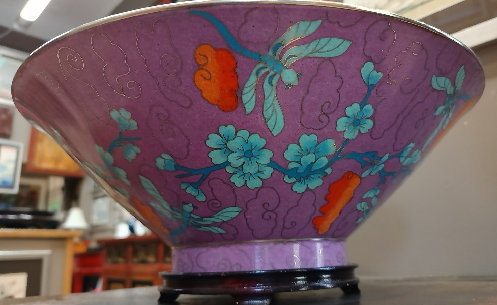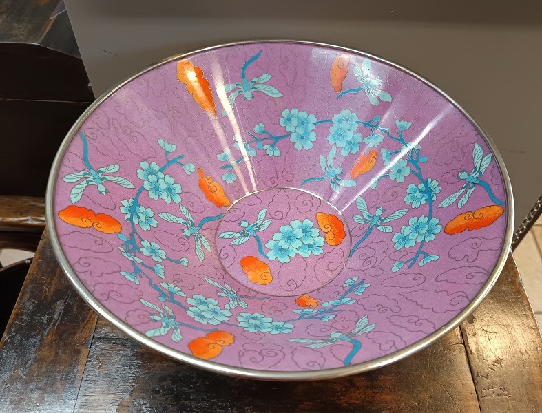 Centro tavola in cloisonné di notevole eleganza, dalla forma ampia e svasata, con profilo armonioso e ben bilanciato. Il bacile poggia su un piede circolare leggermente rialzato, che dona slancio alla struttura e ne facilita l’esposizione; alla base è presente una base in legno scuro che ne valorizza la presenza scenica.