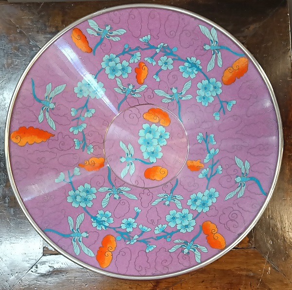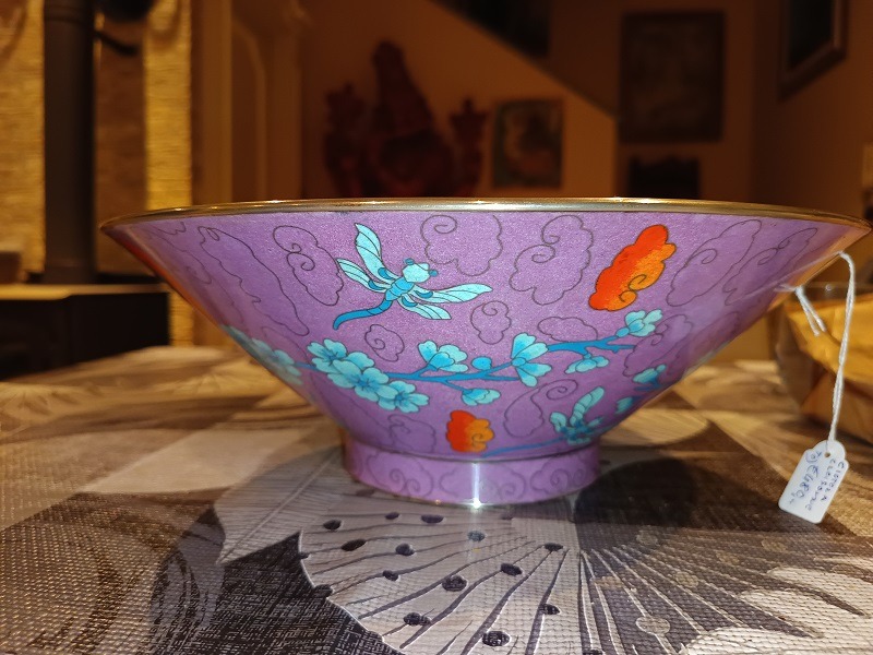 La superficie, sia interna sia esterna, è rivestita da una raffinata smaltatura color lilla-violaceo, decorata con delicati motivi a nuvole stilizzate, tracciati da sottili filamenti metallici tipici della tecnica cloisonné. Su questo fondo si sviluppa una composizione naturalistica di grande raffinatezza, raffigurante libellule in volo e rami fioriti di ciliegio.