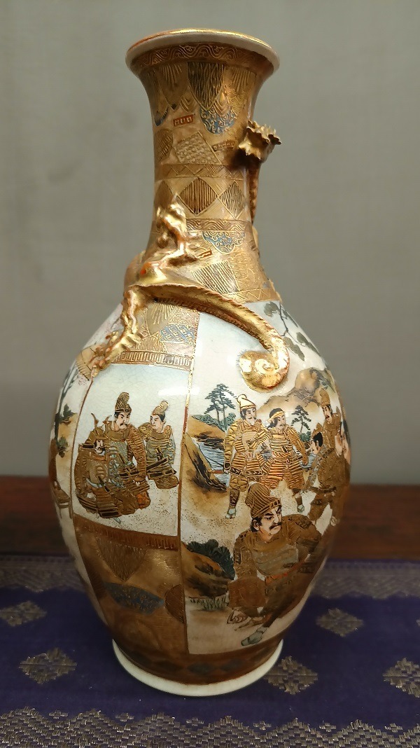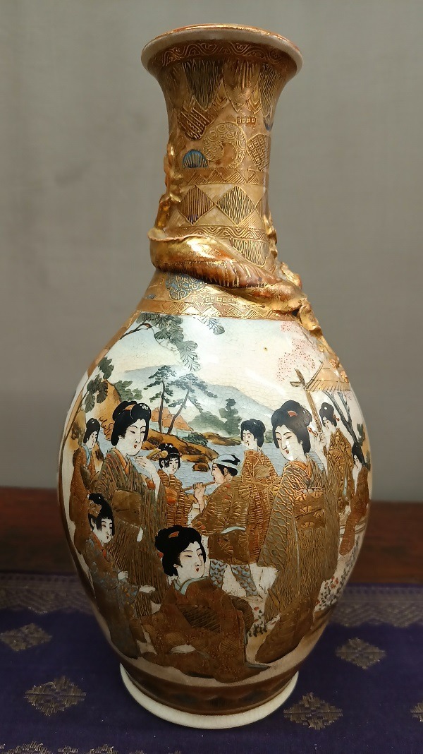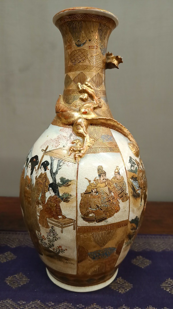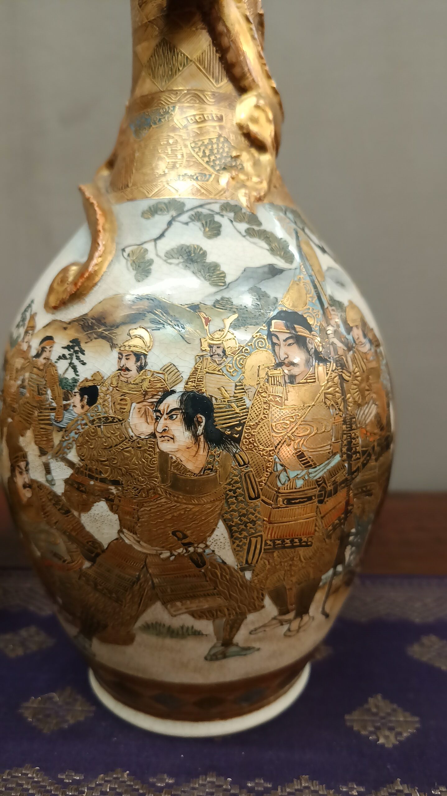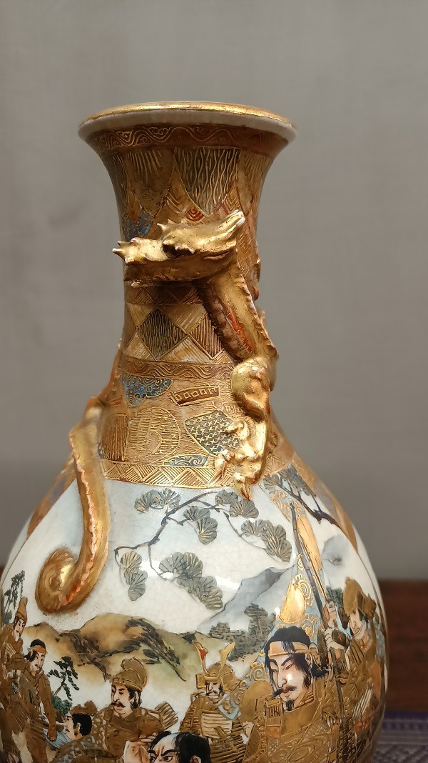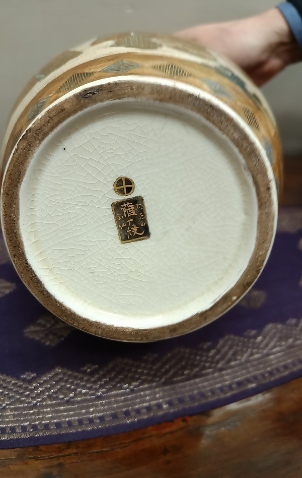 I colori sono caldi e ben bilanciati, con un uso abbondante dell’oro lavorato in diverse tecniche, che dona grande luminosità all’insieme. La superficie presenta la tipica craquelure fine della ceramica Satsuma, elemento distintivo che aggiunge fascino e carattere.
