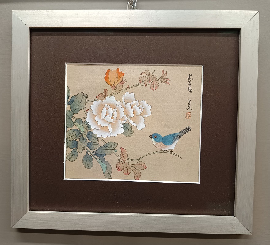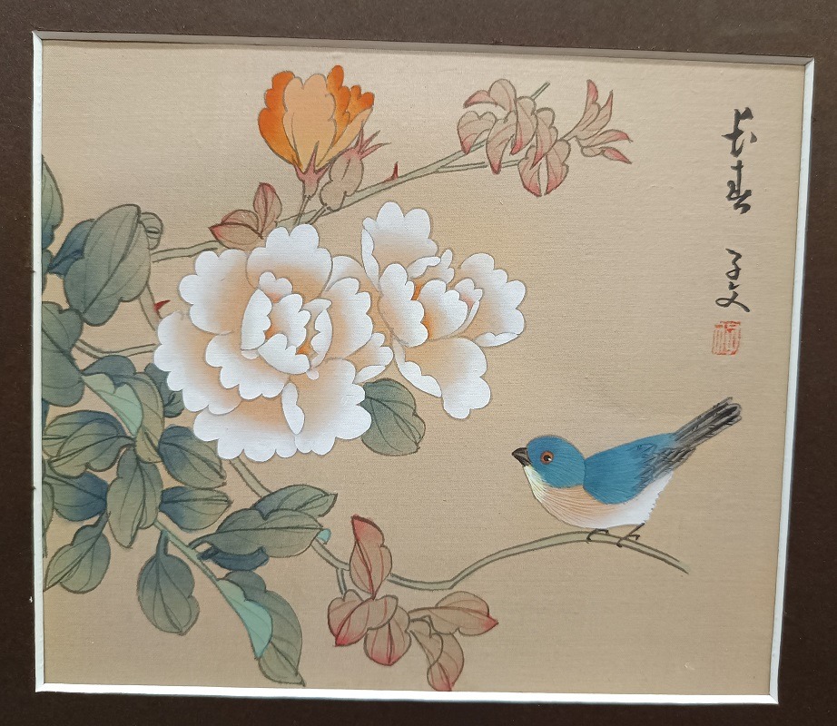 La scena è dominata da splendide fioriture, tra cui peonie – simbolo di prosperità e bellezza nella tradizione cinese – affiancate da boccioli e foglie resi con grande finezza cromatica. L’uccello, dipinto con tonalità vivaci di blu e dettagli accurati, dona equilibrio e armonia all’intera composizione.