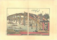 Nel libro illustrato di Hokusai “Entrambe le rive del fiume Sumida”, l’artista offre una vista panoramica della vita a Edo lungo il fiume Sumida, mostrando il lungomare in diverse stagioni e intemperie. I viaggiatori attraversano il canale con i traghetti, passeggiano lungo i negozi che fiancheggiano la riva e attraversano i numerosi ponti sul fiume. Le scene sono create per formare un’immagine continua della riva del fiume da un dittico all’altro, passando dalla baia di Edo a Capodanno al quartiere dei divertimenti di Yoshiwara.