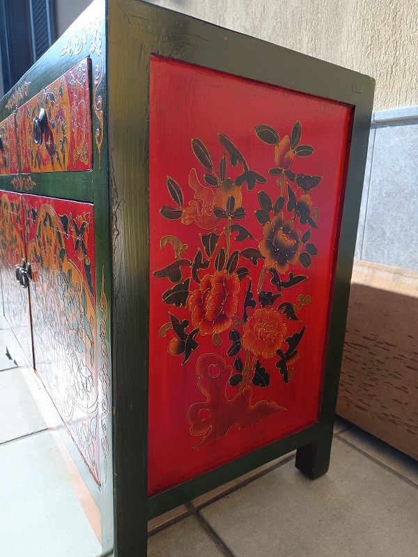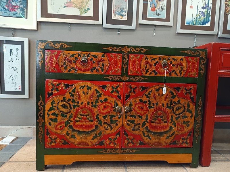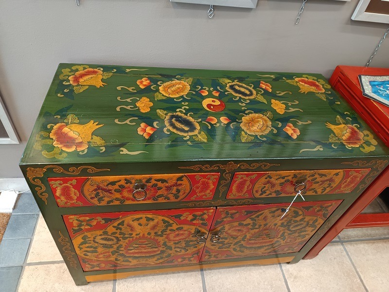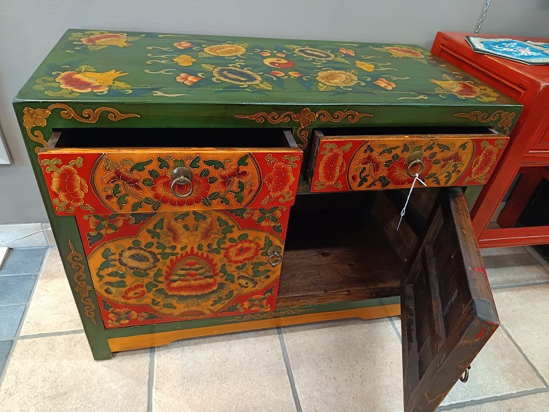 Di pregiata fattura, interamente decorato a mano secondo la tradizione artigianale tibetana. Il mobile è decorato su tre lati e sul piano, rendendolo ideale anche come elemento d’arredo da centro stanza.
