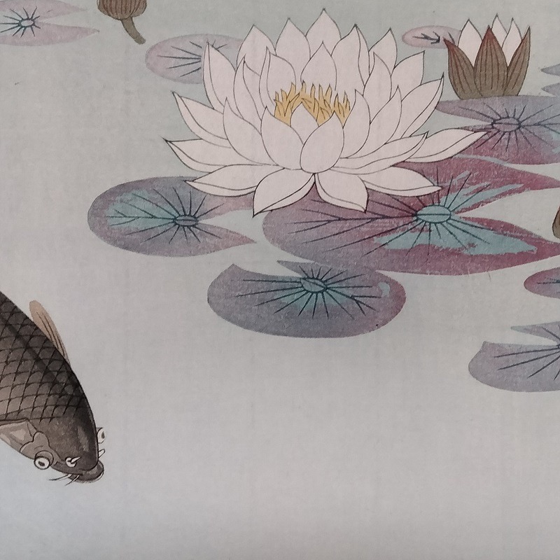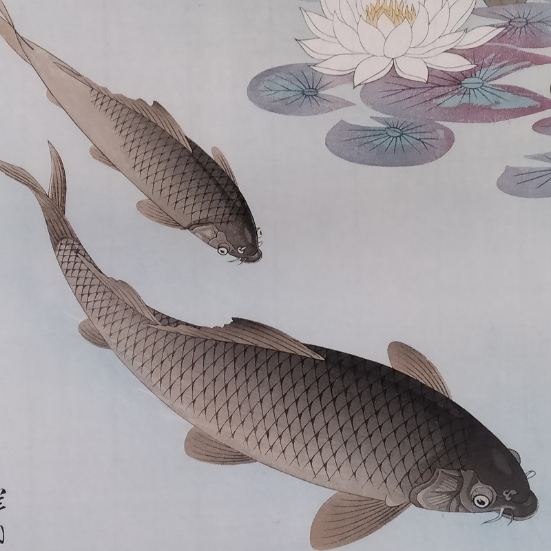 Questa xilografia meravigliosa raffigura una coppia di carpe che nuotano liberamente vicino a delle splendide nifee fiorite, nelle acque limpide e cristalline di un lago. Koson ha utilizzato la goffratura per i contorni dei pesci, inoltre la testa, le squame e le pinne sono finemente dettagliate. Il realismo che ne deriva è sorprendente.