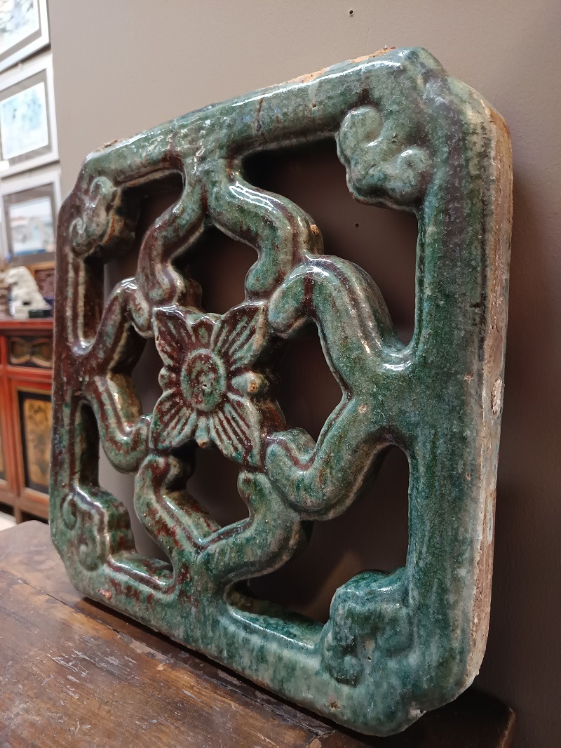Piastrella antica architettonica cinese in ceramica smaltata su entrambi i lati. Epoca: Fine XIX secolo (tarda dinastia Qing).