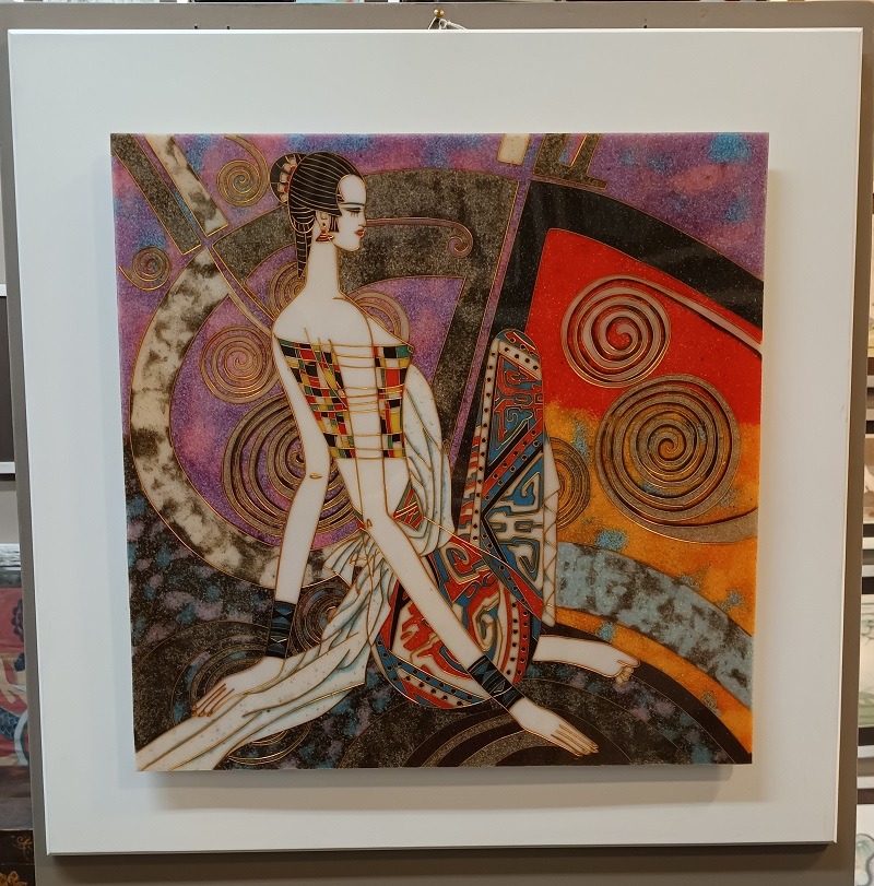 Quadro tecnica cloisonné, La donna seduta