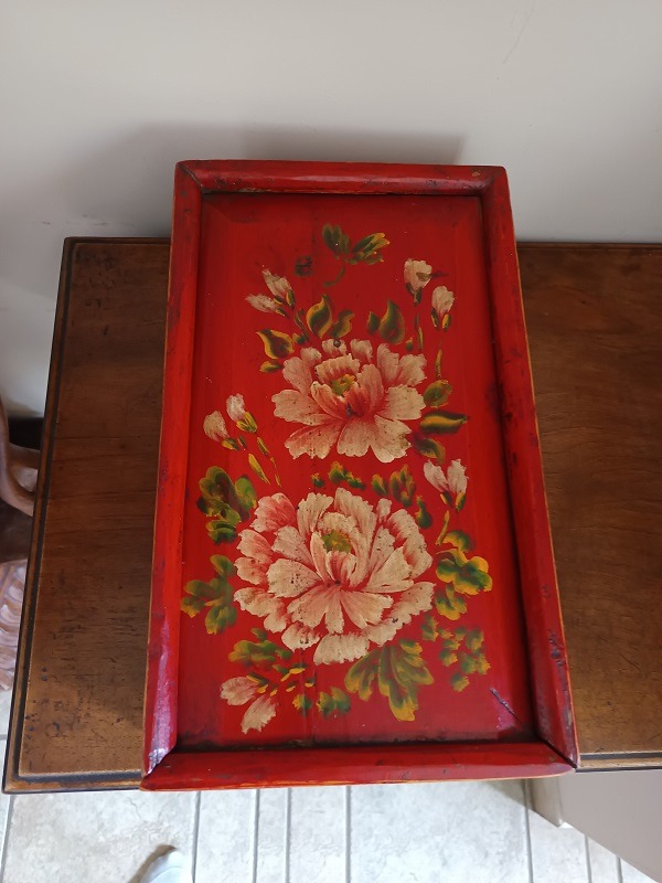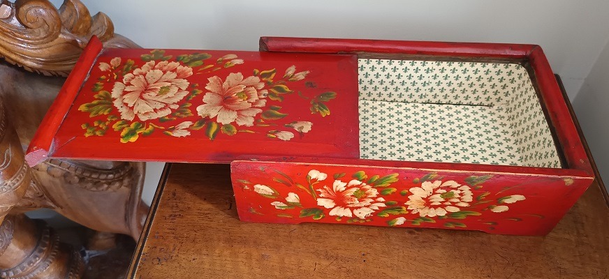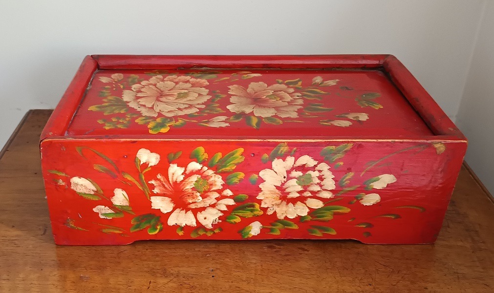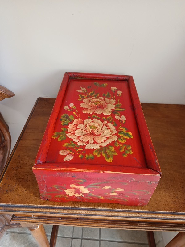 Laccature di colore rosso e raffinati decori a motivi floreali.