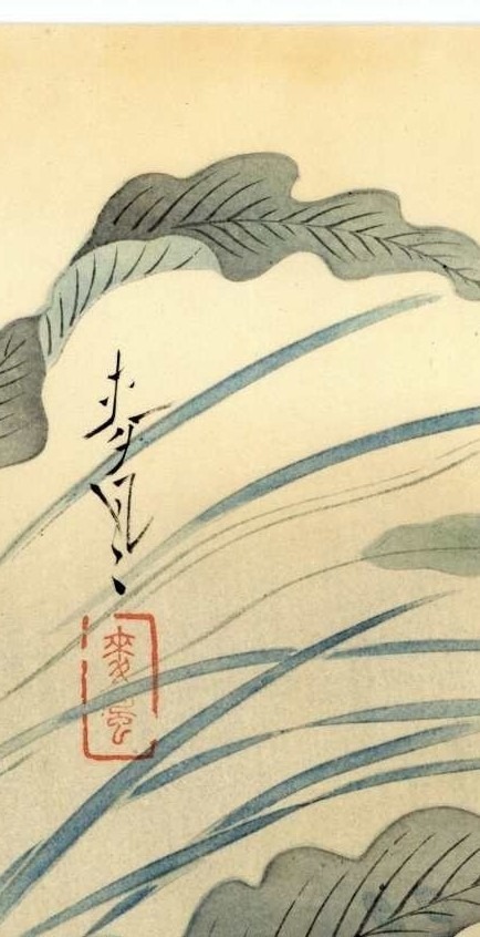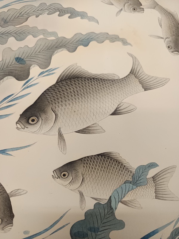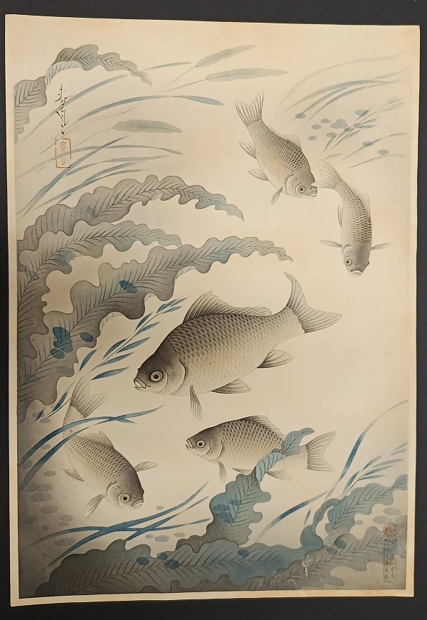 In questa stampa, Bakufu Ohno cattura la grazia fluida e la leggerezza delle carpe Koi. I pesci, così finemente eseguiti, sembrano prendere vita nell’acqua, danzando con grazia e leggerezza. I colori delicati e armoniosi rendono ogni dettaglio poetico: le scaglie sembrano riflettere lievi bagliori, le pinne appaiono trasparenti e leggere, e il movimento sinuoso dei pesci conferisce alla composizione una dinamicità elegante e silenziosa.
