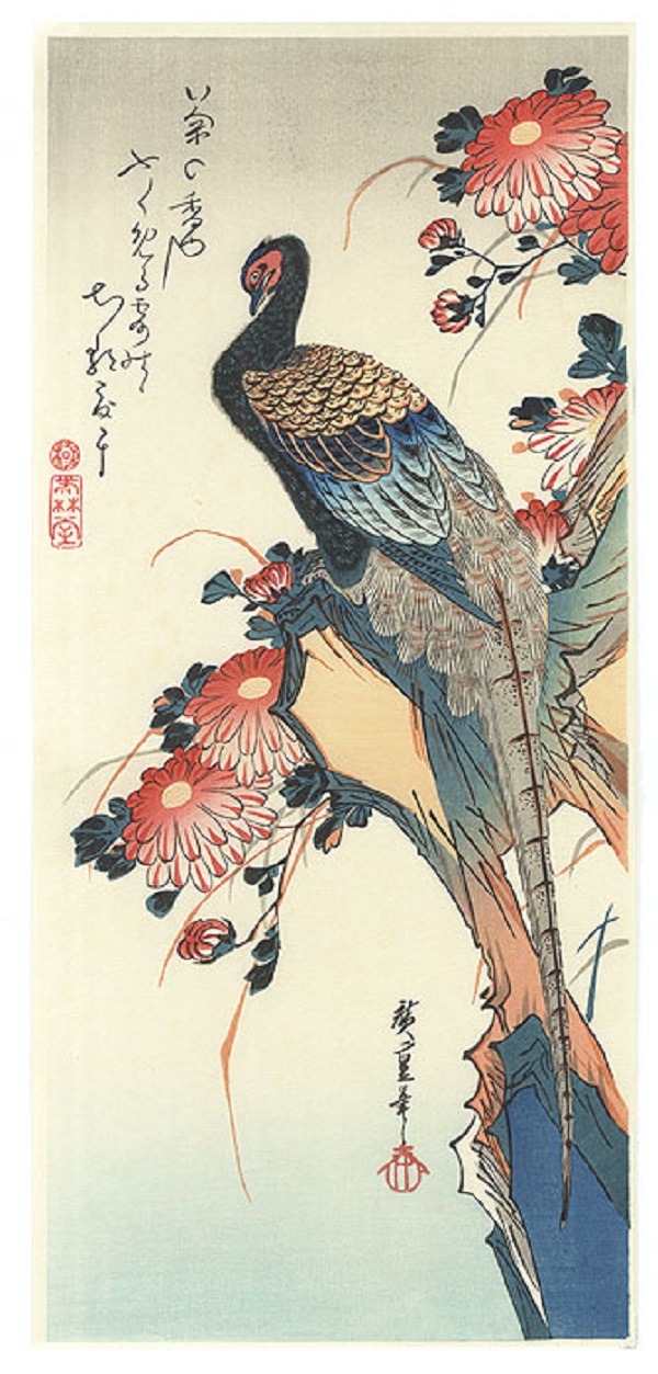 Davanti a noi si staglia un fagiano maestoso, il suo sguardo fiero rivolto verso l’orizzonte, adagiato su una roccia tra i flessuosi steli e i grandi fiori di crisantemo che danzano nel vento leggero dell’autunno.