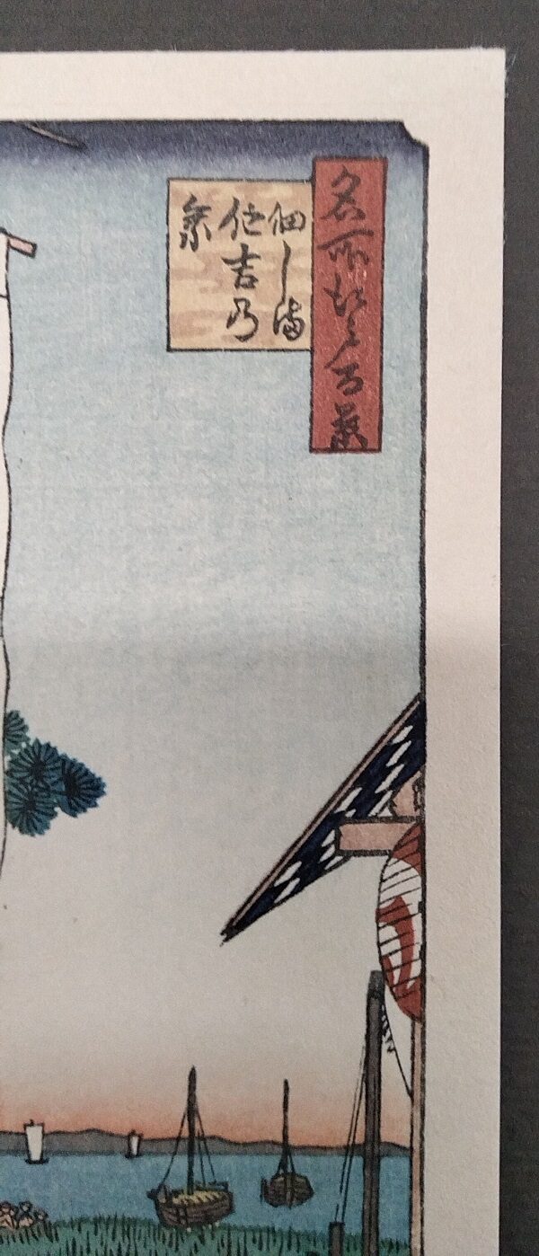 Il 30 giugno 1964 l‘Associazione di Tokyo degli artisti della stampa su legno ukiyo-e, pubblicò questa piccola edizione commemorativa di 30 stampe scegliendo le più belle e significative opere della serie “Cento famose vedute di Edo”, Meisho Edo hyakkei ,(1856-1858). È molto raro reperire questa serie in un formato cosi ridotto (tipo cartolina).