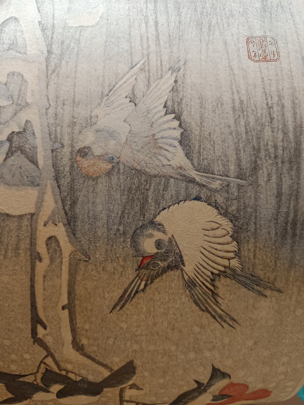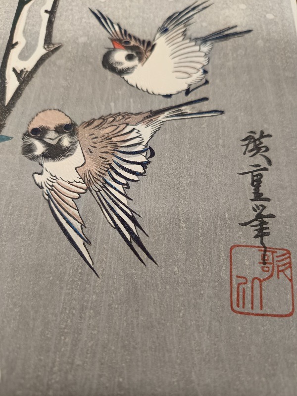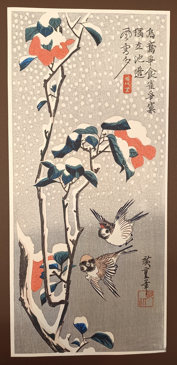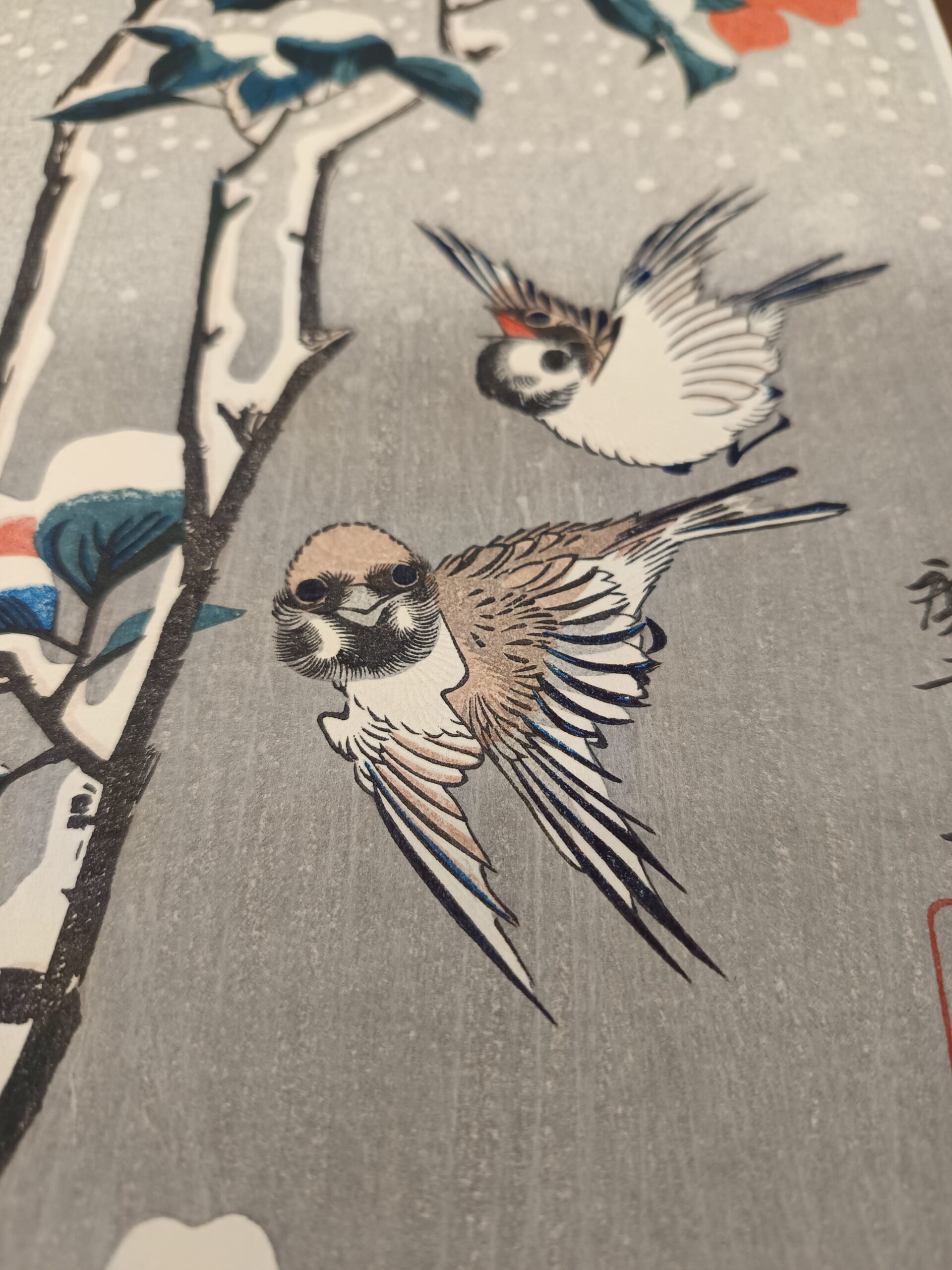 Hiroshige cattura questo istante effimero — un istante in cui il freddo non spegne la bellezza, ma la esalta; in cui la neve non cancella la vita, ma la fa brillare in un silenzio più profondo. Il rosso della camelia e il volo dei passeri emergono come note di calore, piccole scintille che resistono all’inverno e ne attraversano la calma severa.