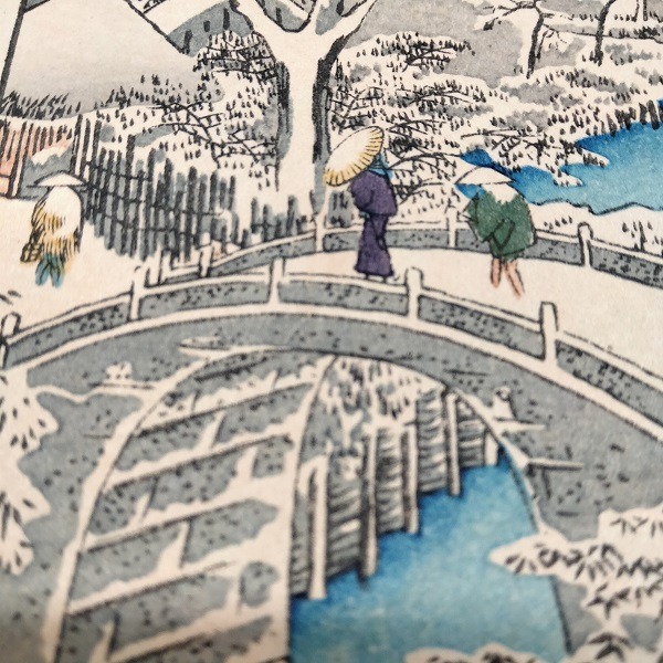 Il 30 giugno 1964 l‘Associazione di Tokyo degli artisti della stampa su legno ukiyo-e, pubblicò questa piccola edizione commemorativa di 30 stampe scegliendo le più belle e significative opere della serie “Cento famose vedute di Edo”, Meisho Edo hyakkei ,(1856-1858). È molto raro reperire questa serie in un formato cosi ridotto (tipo cartolina).